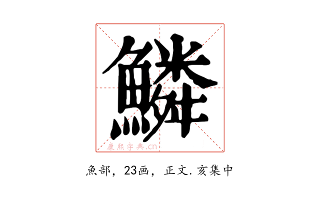 〔鱗〕字收录于《康熙字典》正文・亥集中,康熙部首是魚部。