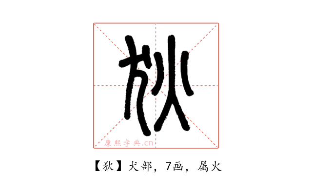 甲骨文字形從犬、大聲。「犬」為狗,作為形符,表示義與犬有關;「大」為人正面張臂跨立之形,乃人體最大之形貌,故引申而為大小之大,於此作為示義的聲符,表示音讀。金文字形仍從犬,而「大」字則變形為「亦」;「大」、「火」形近,故金文或有訛作從犬、從火者,而為篆文、隸書及楷書之所本。在六書中屬於形聲兼會意。