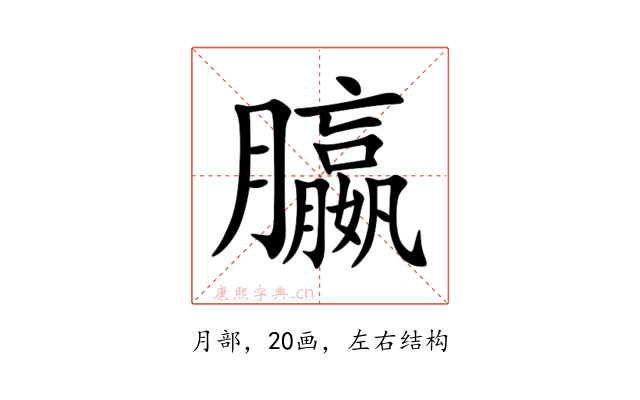 〔䑉〕字是左右结构,可拆字为“月、嬴”或“⺼、嬴”。