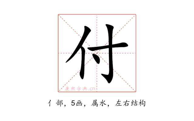〔付〕字是左右结构,可拆字为“亻、寸”,五行属水。