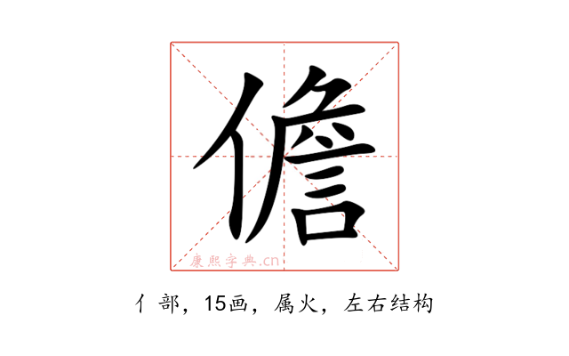 〔儋〕字是左右结构,可拆字为“亻、詹”,五行属火。