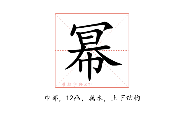 〔幂〕字是上下结构,可拆字为“𠖇、巾”,五行属水。