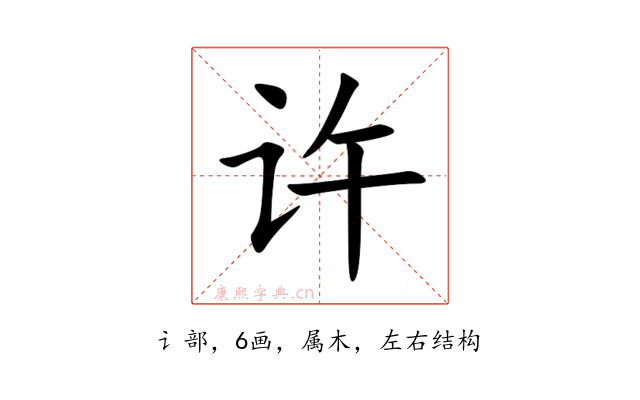 〔许〕字是左右结构,可拆字为“讠、午”,五行属木。