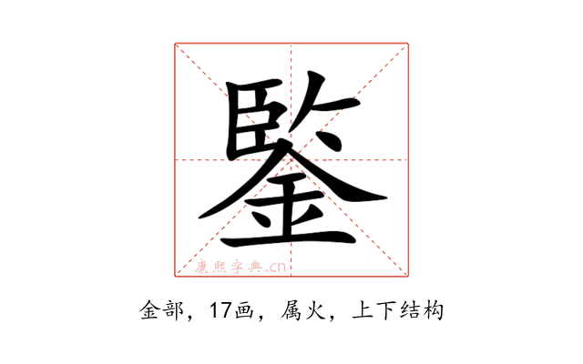 〔鍳〕字是上下结构,可拆字为“臣、𠂉、丶、金”。