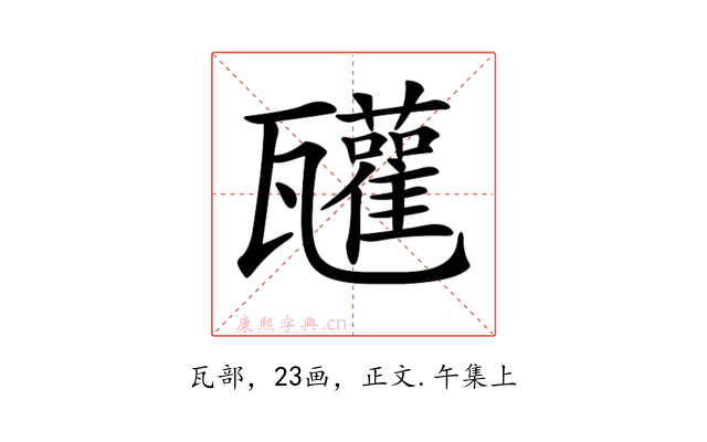 〔𤮳〕字收录于《康熙字典》正文・午集上,康熙部首是瓦部。