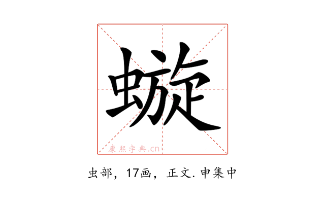 〔𧐗〕字拼音是xuán,左右结构,可拆字为虫、旋。
