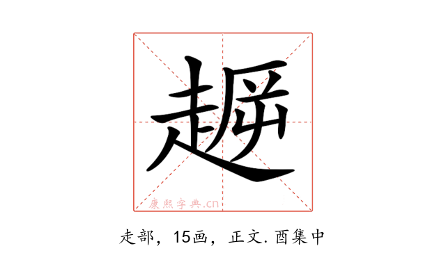 〔𧼞〕字收录于《康熙字典》正文・酉集中,康熙部首是走部。