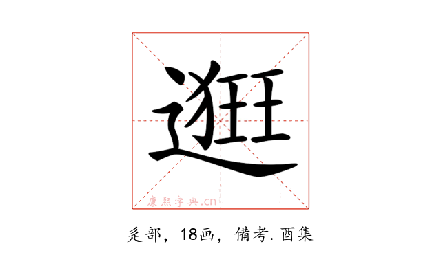 〔𨖢〕字拼音是kuáng,半包围结构,可拆字为辶、犭、玨。