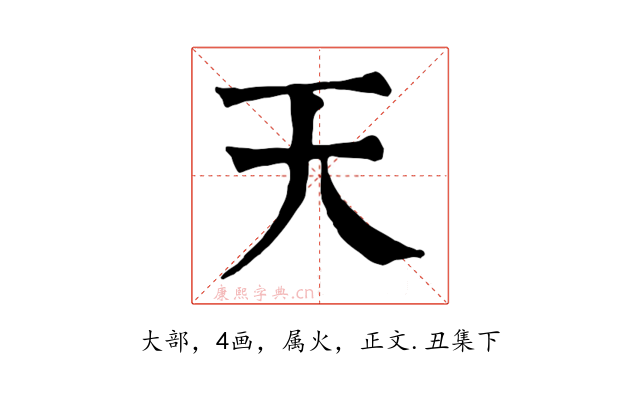 〔天〕字收录于《康熙字典》正文・丑集下,康熙部首是大部