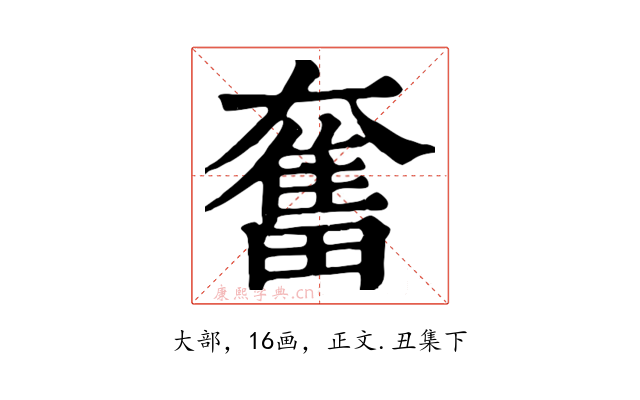 〔奮〕字收录于《康熙字典》正文・丑集下,康熙部首是大部。
