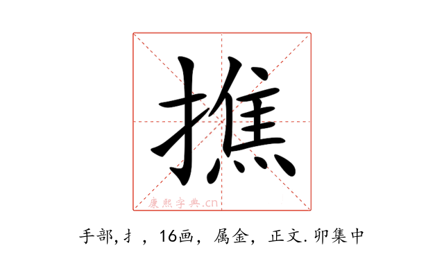 〔撨〕字是多音字,拼音是xiāo、sōu,左右结构,可拆字为扌、焦