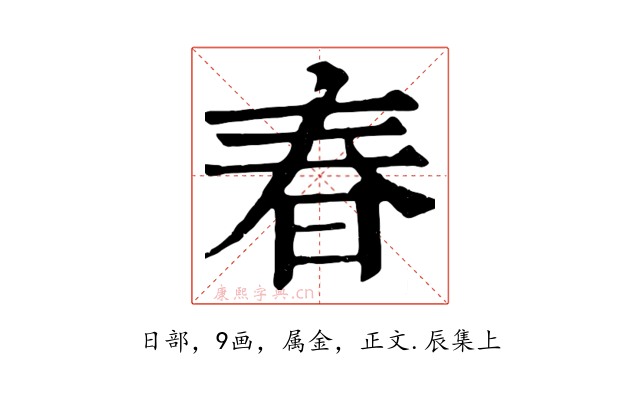 〔春〕字收录于《康熙字典》正文・辰集上,康熙部首是日部。