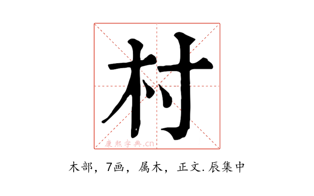 〔村〕字收录于《康熙字典》正文・辰集中,康熙部首是木部。