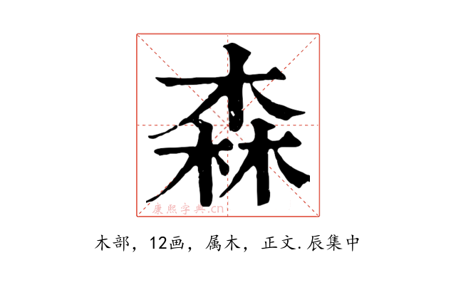〔森〕字收录于《康熙字典》正文・辰集中,康熙部首是木部。