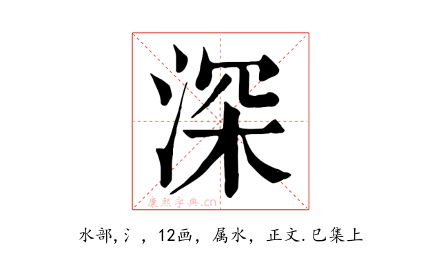 〔深〕字收录于《康熙字典》正文・巳集上,康熙部首是水部。