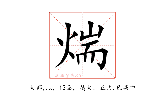 〔煓〕字收录于《康熙字典》正文・巳集中,康熙部首是火部。