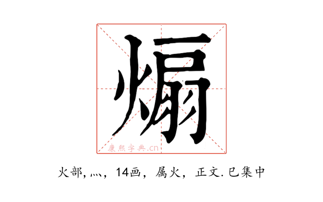〔煽〕字收录于《康熙字典》正文・巳集中,康熙部首是火部。