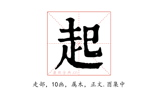 〔起〕字收录于《康熙字典》正文・酉集中,康熙部首是走部。