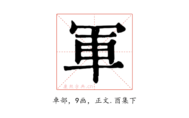 〔軍〕字收录于《康熙字典》正文・酉集下,康熙部首是車部。