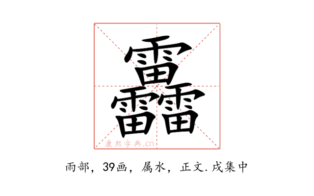〔靐〕字收录于《康熙字典》正文・戌集中,康熙部首是雨部。