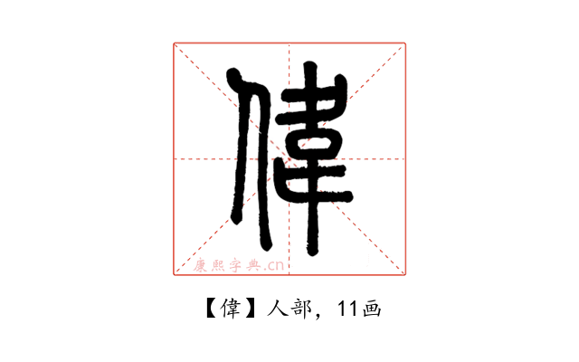 伟,特别高大的身材。字形采用“人”作边旁,采用“韦”作声旁。