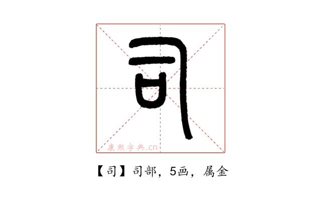 司,在外办事的官史。字形采用反写的“后”字。所有与司相关的字,都采用“司”作边旁。