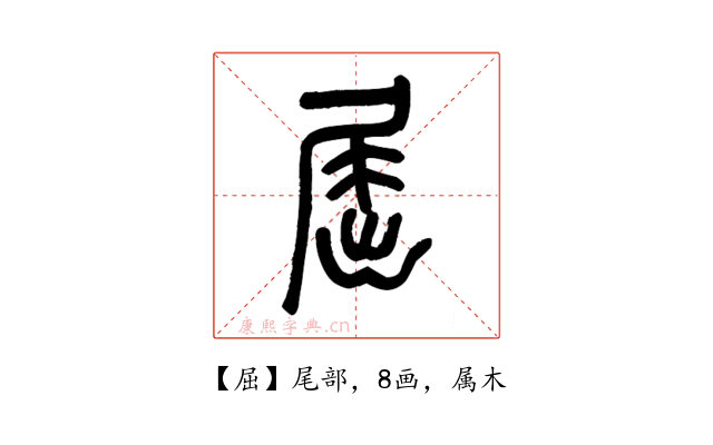屈,最早見於戰國金文。字從尾、出聲。在六書中屬於形聲。《說文》:「無尾也。」段注:「凡短尾曰屈,引伸為凡短之偁。今人屈伸字古作詘申,不用屈字。此古今之異也。」字至隸書改從尸。楷書字形由隸書而來。
