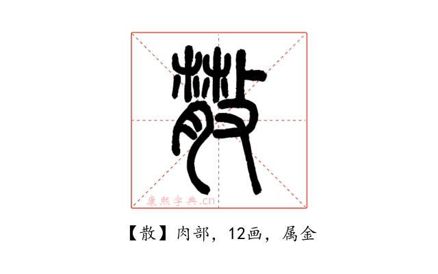 附注王筠句讀:「散字从肉,故說曰雜肉。實是散碎通用之字,故元應取雜而刪肉也。」林義光《文源》:「散為雜,無雜肉之義……(古)从月,不从肉。月即夕字,象物形,从攴,