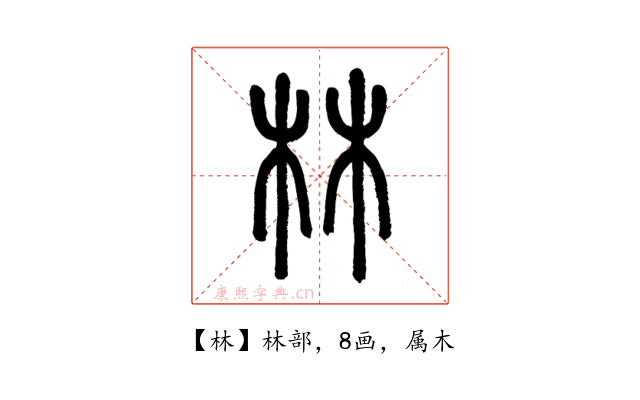 林,平坦地面上有丛生的树木叫作“林”。字形采用两个“木”会义。所有与林相关的字,都采用“林”作边旁。