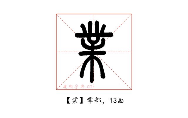 业,乐器架子上方横木上的大版。是用来装饰支架、悬挂钟鼓的大版。大版形状参差不齐像锯齿,并用白色颜料涂画。大版和所悬钟鼓之间,参差错落又相互承接。字形采用“丵、巾”会义。“巾”像版形。《诗经》有诗句唱道:“大版系在柏木上。” ,这是古文写法的“业”。