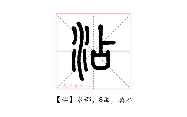 此字始見於篆文,字形從水、占聲。從水,表示與水相關;占聲,表示音讀。隸變作,楷定作沾。在六書中屬於形聲。