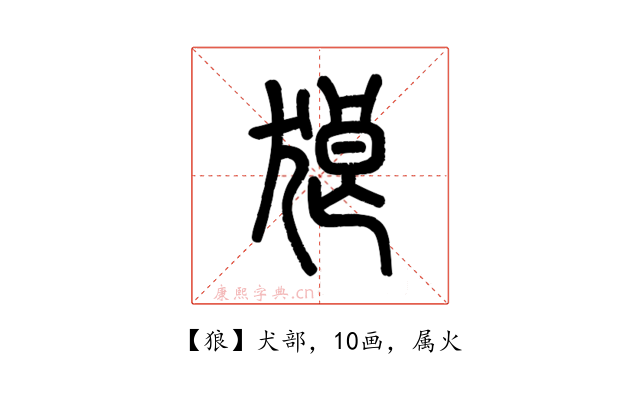 狼,形似犬,尖锐的头,白色的颊,高耸的部前,开阔的后部。字形采用“犬”作边旁,“良”是声旁
