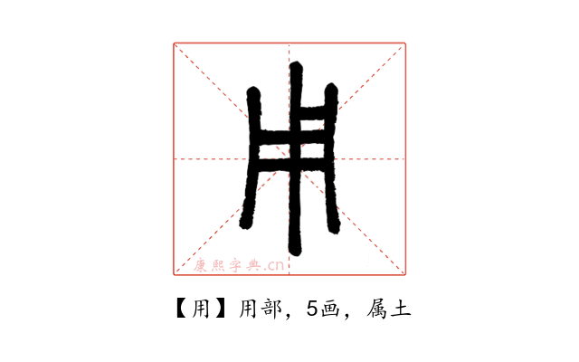 用,可以施行。字形采用“卜、中”会义。注:此论是旁引卫宏先生对“用”的本义说法。所有与用相关的字,都采用“用”作边旁。,这是古文写法的“用”字。