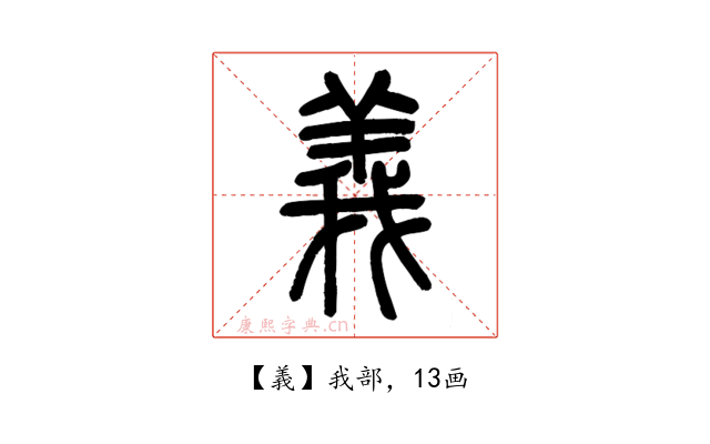 义,我军威武的出征仪式。字形采用“我、羊”会义。羛,《墨翟书》上“義”字采用“弗”作边旁。魏郡有个地方叫“羛阳乡”, 其“羛”字读作“锜”。该地现属鄴县,本来在内黃县北边二十里的地方。