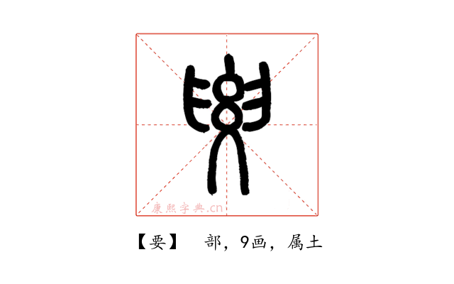此字始見於戰國文字,下從「女」,上像兩手插腰的樣子。篆文從「?(ㄐㄩˊ jú)」,像人雙手;中間像人站立,也就是人插腰站立的形狀。在六書中屬於合體象形。另外《說文》收有古文,形與戰國文字相近似。隸書一個從篆文來;另外一個從戰國文字及《說文》所收錄古文來,下從「女」,但是字形上方雙手插腰的部分已經誤變為「西」,楷書就是沿襲此形作「要」。