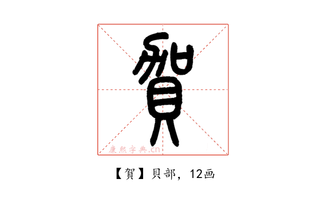 贺,以礼物捧场庆祝。字形采用“贝”作边旁,“加”作声旁。