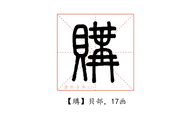 购,以钱财悬赏他人做某事。字形采用“贝”作边旁,“冓”作声旁。