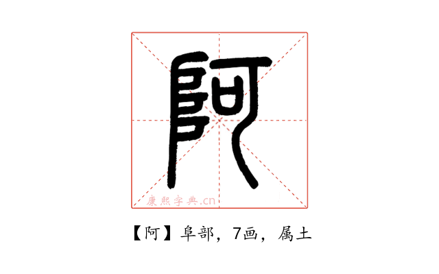 阿,巨大的山陵。一种说法认为,“阿”是曲阜。字形采用“曲”作边旁,“可”是声旁。