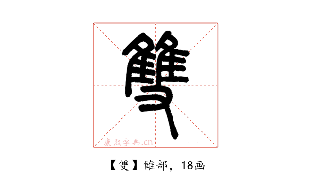雙,手持鸟雀两只。字形采用“雔”作边旁,“又”表示用手抓着两只鸟。