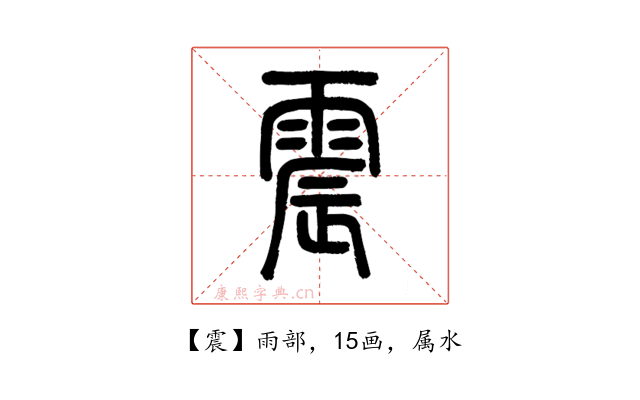 震,天穹的劈历,振动室内物什。字形采用“雨字头”,“辰”是声旁。《春秋传》上说:“响雷震撼夷伯的庙堂。”