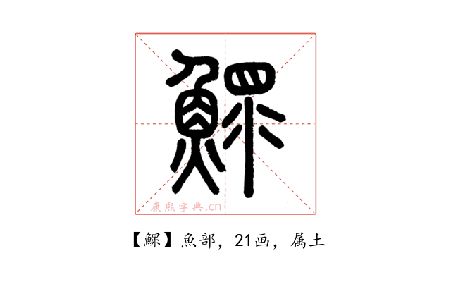 鳏,一种鱼。字形采用“鱼”作边旁,“眔”作声旁。李阳冰说;"鳏字应该是采用囗(眔+弟)作边旁。”