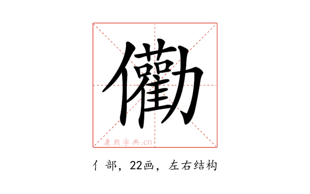 〔𠑧〕字是左右结构,可拆字为“亻、勸”。