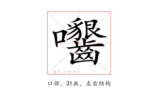 〔𡆟〕字是左右结构,可拆字为“口、𱌦”或“口、貇、齒”。