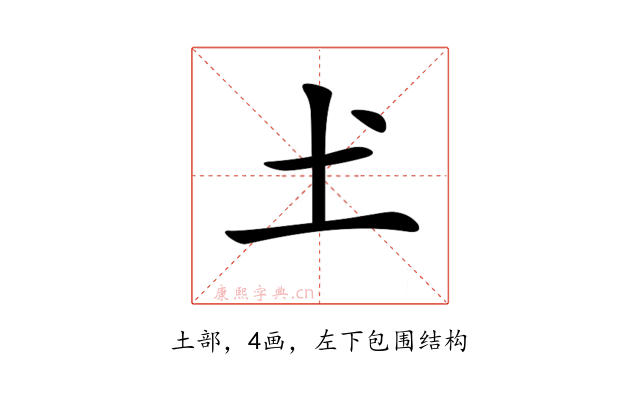 〔𡈽〕字是左下包围结构,可拆字为“土、丶”。