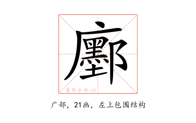 〔𢌅〕字是左上包围结构,可拆字为“广、墨、阝”或“广、墨、⻏”。