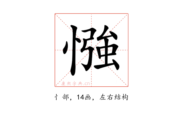 〔𢠌〕字是多音字,拼音是(qiáng、xián),部首是忄部,总笔画是14画。