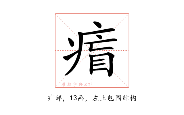 〔𤷐〕字是左上包围结构,可拆字为“疒、盲”。
