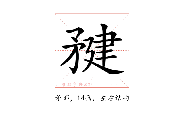 〔𥍹〕字是左右结构,可拆字为“矛、建”。