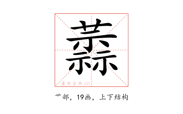 〔𧁞〕字是上下结构,三叠字 (含三叠字结构),可拆字为“䒬、祘”或“艹、示、祘”。