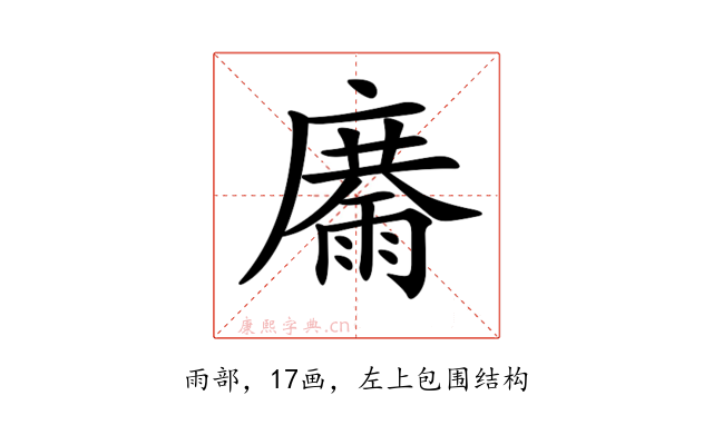 〔𩃽〕字是左上包围结构,可拆字为“𢈎、雨”或“广、共、雨”。